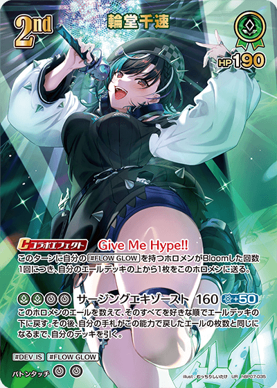輪堂千速はディーヴァフィーバー収録の2ndホロメンです。ターン中にブルームした数だけコラボ時に自身にエールを加速でき、サブアタッカーやリソース回復として優秀な1枚です。