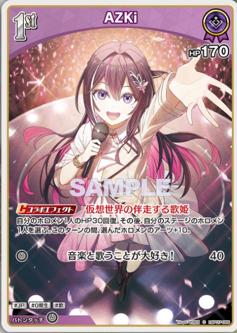 ![]() 推し AZKi(紫) | ・推しステージスキルでセンターAZKiの火力UP ・推しスキルでイベントサーチ ┗前ターンにダウンしていることが必須 ┗重要なイベント「フロンティアスピリット」がサーチ可能 |