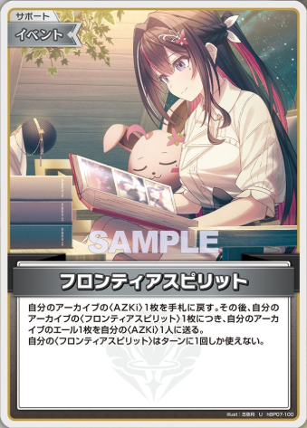 ![]() フロンティアスピリット | 役割:アーカイブ回収とエール回収 ・アーカイブからAZKiを広いながらアーカイブのフロンティアスピリットの枚数1枚に付きアーカイブからエールを1枚回収 ┗打ってる時点ではアーカイブに落ちていないため1枚目はエール0枚回収 |