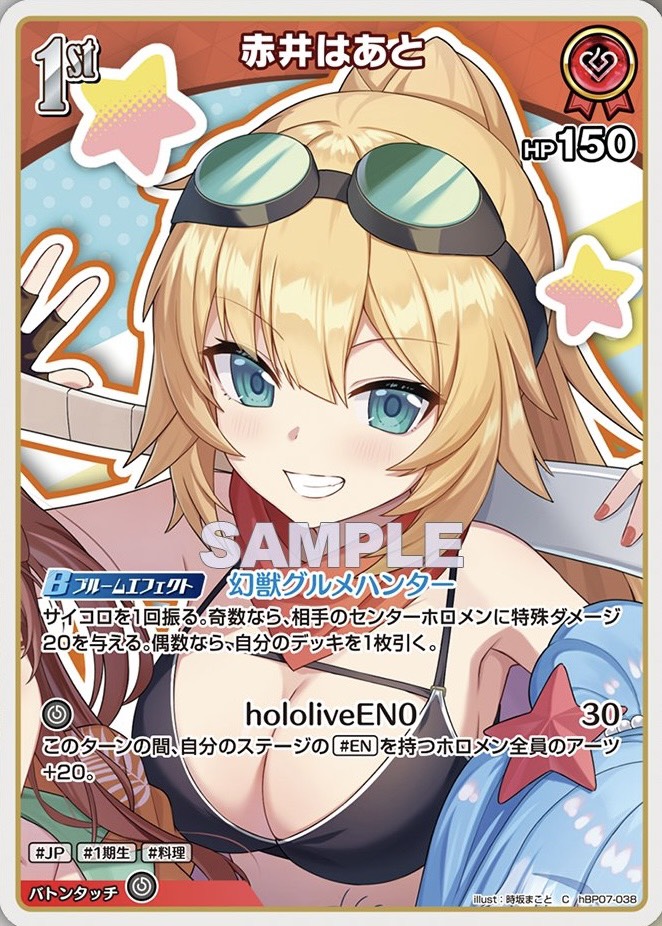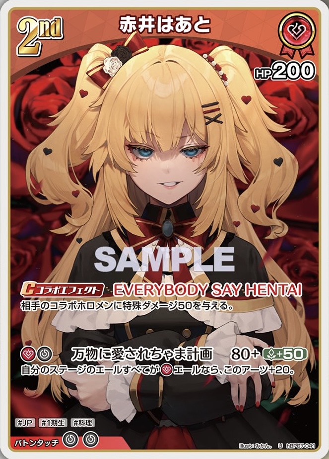 ![]() 推し | 役割:ドロー&バフ ステージスキル:ターンに1回赤井はあとがデッキの下に戻ったら2枚ドロー 推しスキル -2:バックのDebutの赤井はあとを1枚デッキ下に戻して、はあちゃま1人のアーツ+50 | |