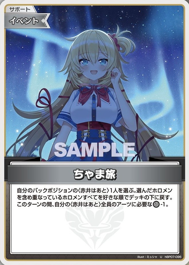 ![]() ちゃま旅 | 役割:エール軽減 バックのはあちゃま1人をデッキ下に戻し、このターンはあちゃま全員のアーツに必要な無色エールを1軽減! | |