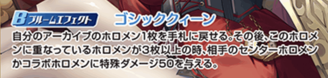 | 効果 | 自分のアーカイブのホロメン1枚を手札に戻せる。その後、このホロメンに重なっているホロメンが3枚以上の時、相手のセンターホロメンかコラボホロメンに特殊ダメージ50を与える。 | ||