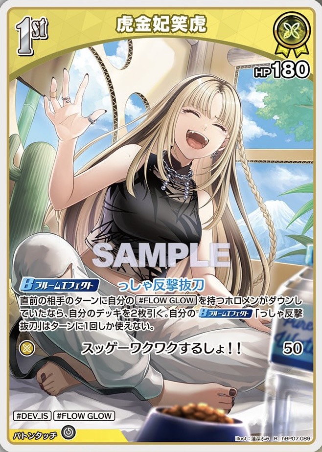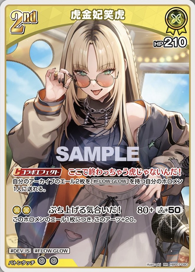 ・パフォーマンスステップ開始時に手札のFLOW GLOW1枚をアーカイブすることで、アーカイブの黄エール1枚を「笑虎」一人に送る