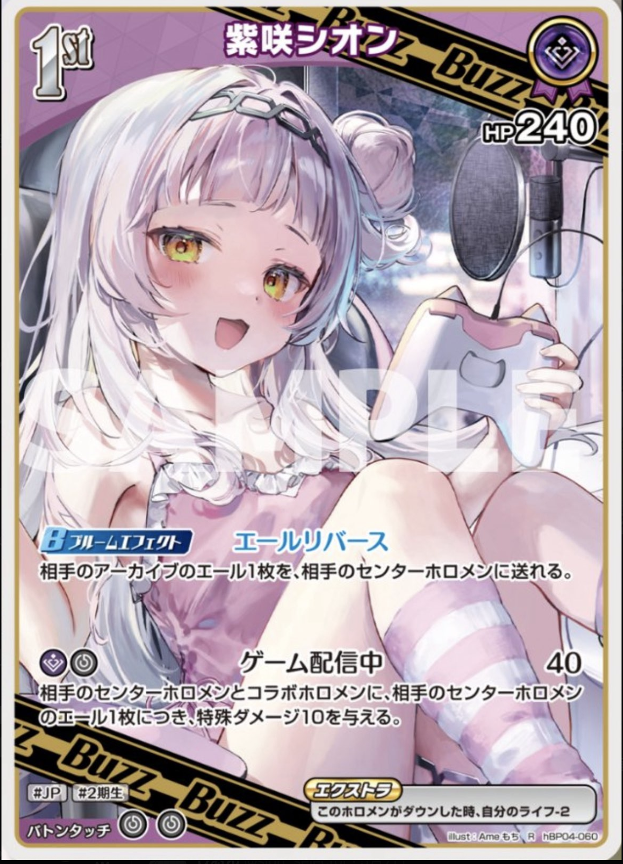 ![]() Buzz 紫咲シオン | 役割:ダメージUPと2ndへの繋ぎ ・HPが240で高い耐久性能。 ・アーカイブから相手のセンターホロメンにエールを確定付与。 ┗センターのエール依存でダメージ量が変わるシオンデッキにとって とても優秀な効果。 | |