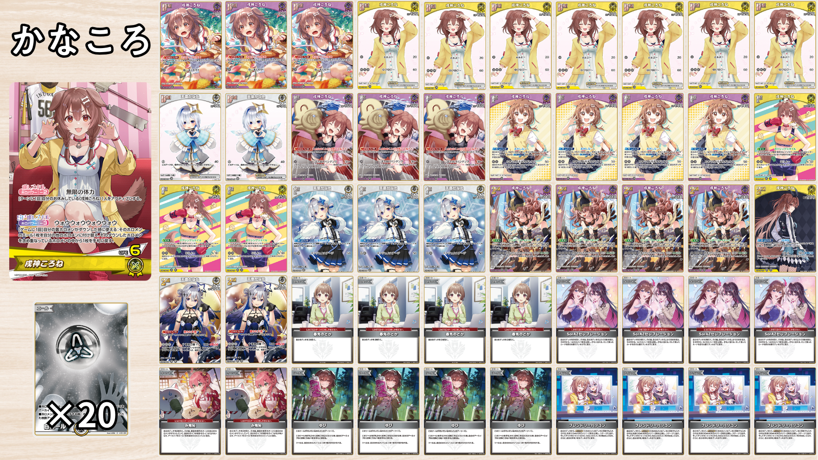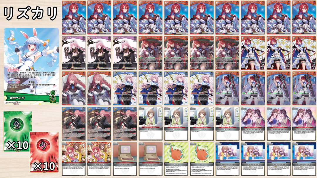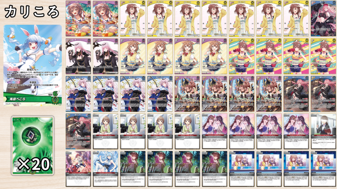| ・ころねに有利を取れる数少ないデッキ ・HP240を2面に立てて耐久する動きが特徴! ・打点が足りなくなりがちなため、かなり使用難易度が高め |