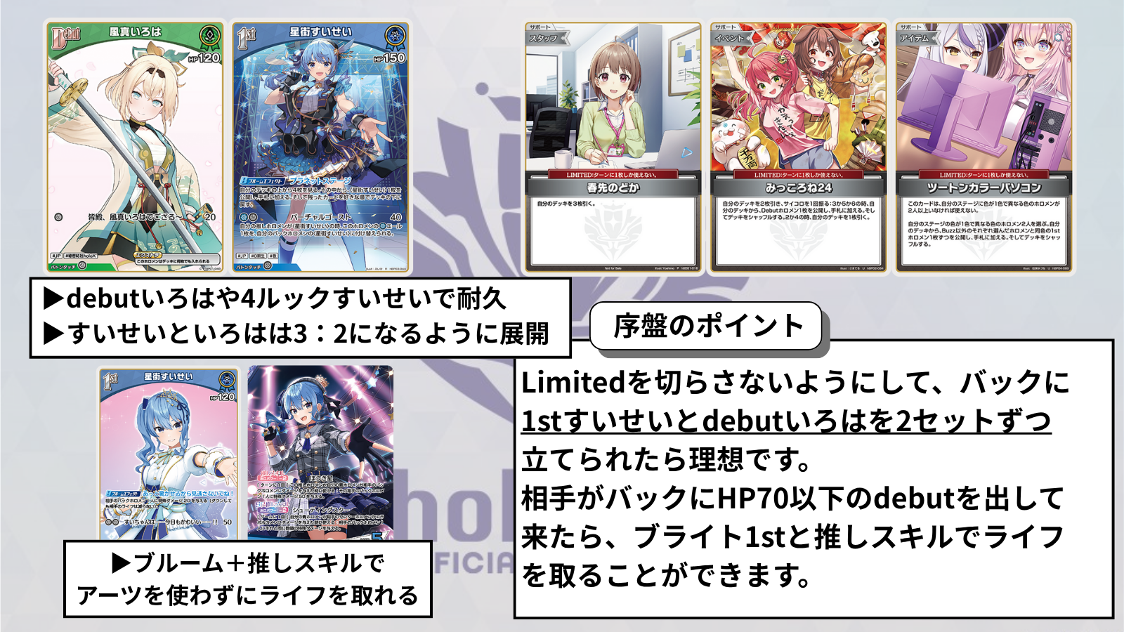 | 中盤以降 | ・ライフを使って常に2ndすいせいが攻撃できる状況を作る ・2ndすいせいをセンターにして戦う ・相手の次ターンのできる行動を読んで2体目の2ndをコラボエフェクトを使い育てる。 ・推しスキルで相手バックのデビューを倒しライフ差をつけていく ・2ndいろはでエール回収しながら打点の伸びないターンを無くす | ||