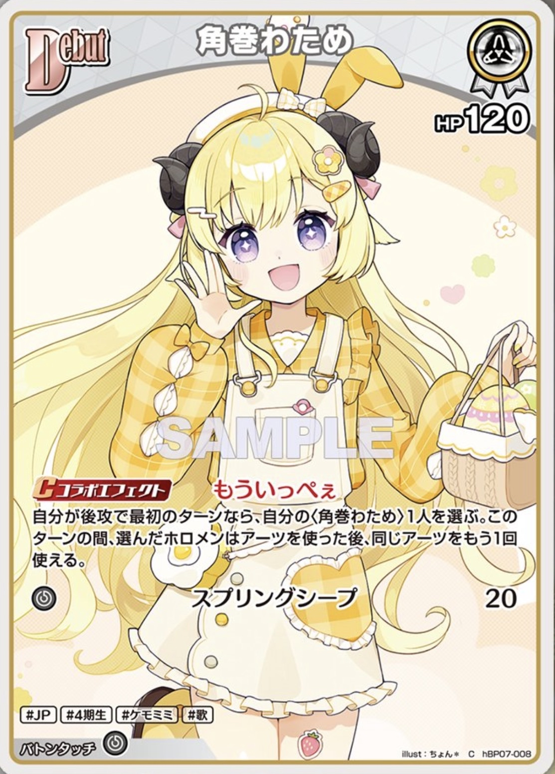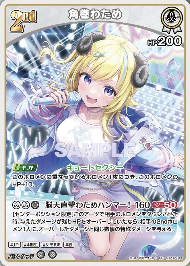 ![]() | ・ギフトでこのホロメンに重なっているホロメン1枚につきHP+10 ・アーツ効果で相手のホロメンをダウンさせたとき、与えたダメージの超過分を相手の2ndホロメンに特殊ダメージを与えることができる。 |