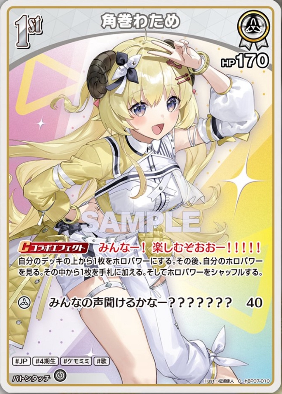 ![]() | ・HP170,1エール40点 ・コラボエフェクトでデッキの上から1枚をホロパワーにして、ホロパワーの中から1枚手札に加えられる。 |